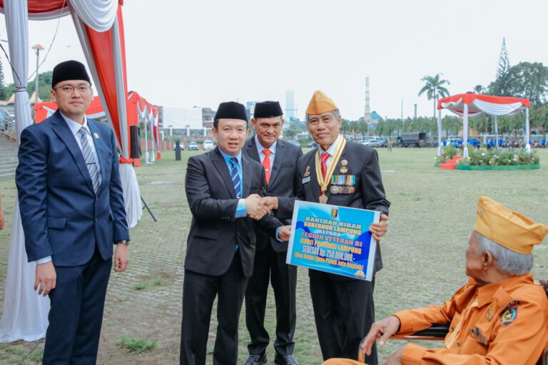 Suarapatriot.com | Bandar Lampung —– Gubernur Lampung Rahmat Mirzani Djausal memberi hibah bantuan kepada Legiun Veteran Republik Indonesia (LVRI) Provinsi Lampung dalam rangkaian Upacara Peringatan Hari Pahlawan 2025 di Lapangan Korpri, Kompleks Kantor Gubernur Lampung, Senin (10/11/2025).