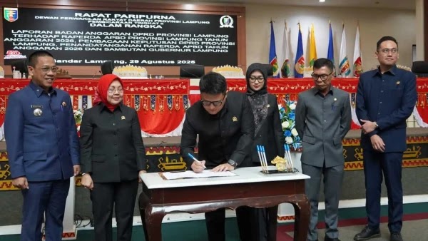 Suarapatriot.com | Bandar Lampung, Pemprov dan DPRD Provinsi Lampung menyepakati Rancangan Peraturan Daerah (Raperda) tentang Anggaran Pendapatan dan Belanja Daerah (APBD) Tahun Anggaran 2026. Persetujuan tersebut ditandai dengan penandatanganan pada rapat paripurna yang digelar di Ruang Sidang DPRD Provinsi Lampung, Jumat (29/8/2025).