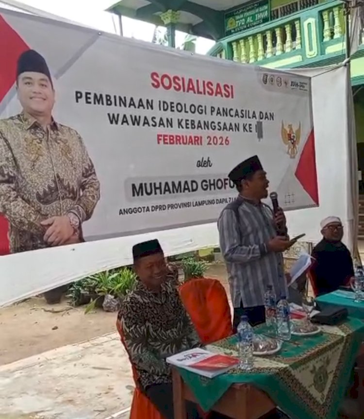 Suarapatriot.com | Lampung Tengah – Anggota Komisi IV DPRD Provinsi Lampung,Muhamad Ghofur, menggelar Sosialisasi Pembinaan Ideologi Pancasila dan Wawasan Kebangsaan di Majelis Taklim Pondok Pesantren Al-Ihya, Kecamatan Kalirejo, KabupatenLampung Tengah, Minggu (15/2/2026).